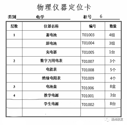 完成了儀器分柜定位存放后,我開始填寫和張貼儀器定位卡。就是在儀器柜每層固定位置張貼填有該層儀器名稱、分類、編號、規(guī)格、型號、數(shù)量、單位等內(nèi)容的定位卡。這樣,只要一看儀器定位卡,就可以對層內(nèi)的儀器心中有數(shù),為物理教師有時自行取用儀器提供了方便。