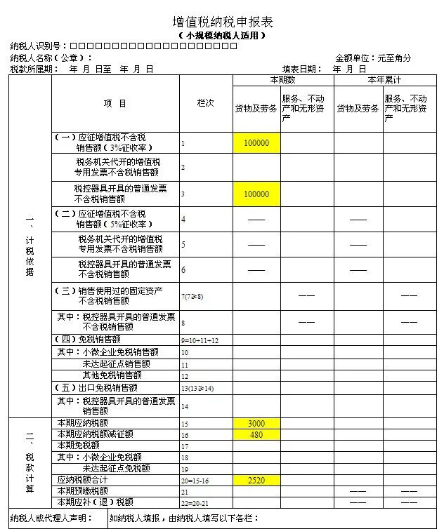 2、《增值稅納稅申報表(適用于小規(guī)模納稅人)》主表: