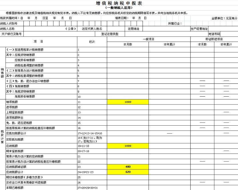 例:某企業(yè)為貨物銷售按月申報一般納稅人,8月首次購買稅控設(shè)備,支付費(fèi)用200元,取得增值稅專用發(fā)票,并于當(dāng)月支付全年技術(shù)維護(hù)服務(wù)費(fèi)280元,取得一份增值稅普通發(fā)票。該納稅人本月應(yīng)納稅額為1000元。如需享受稅控設(shè)備全額抵減優(yōu)惠,申報表應(yīng)填報如下: